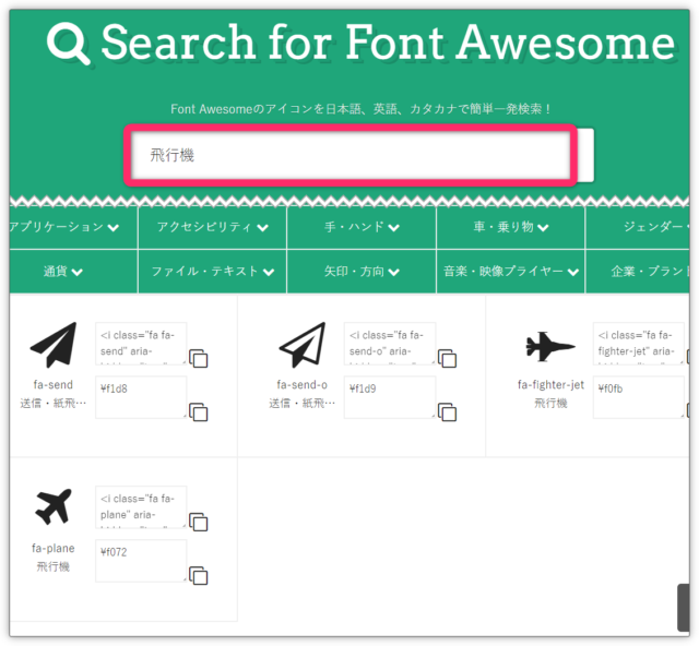 Font Awesomeのアイコンを日本語でも英語でも、一発検索することができます。