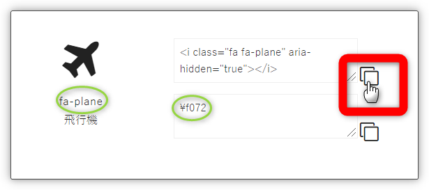赤枠のところをクリックしてhtmlをコピーし、アイコンを表示したい位置の貼り付けます。