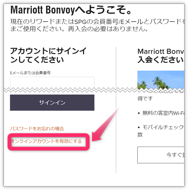 48時間経過し会員番号が有効になったら、マリオットwebサイトでアカウントを作ります。